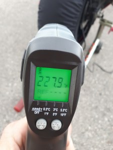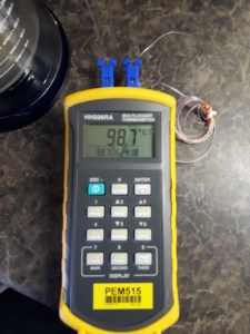 The yellow thermometer is a professionally calibrated unit. The boiling water test confirms both the IR gun and yellow thermocouple reader are accurate. Both devices measured within 1 degree of ambient room temperature @ 20C (68F). Basement bench testing (no wind) on a separate (50% used) KR451 (200/60) tire (no rim) and 448 front showed similar temperature numbers to the track, with a max reading of 112C (233F) which was alarming. The front tire had a max reading of 109C (228F), which is consistent with what we saw at the previous track day. To be fair, testing both without a rim is not the intended use case for tire warmers, but it does raise questions.