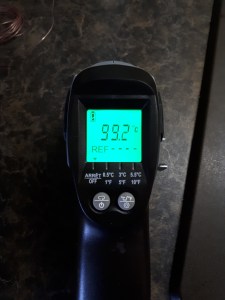 First we’ll establish a baseline. Is the IR gun working? Can we confirm the readings with another measuring device? Let’s boil some water a few hundred meters above sea level (Ontario, Canada) and grab a couple thermocouples while we are at it: