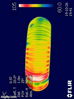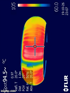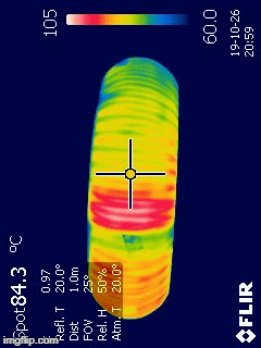 2.) Our suspicion that Moto-D warmers are heating portions of the tire surface, at times, to 110C (230F)+ is substantiated. This only occurs at the peak of the heat cycle just before steady state is reached. However at steady state, the tires can run noticeably higher than their 85C target. We can confirm with the IR camera that both the thermocouples and the IR gun are accurate.