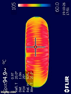 The T4 (yellow, the bottom probe) looks like an outlier and is not supported by our IR image (bottom of the tire should be coolest). That said we see a more gradual lateral heat distribution using the tire sock, with peak readings more inline and a much shorter warming time (~40 min). T1 (blue, top of the tire) shows a peak of 99.6C (211.28F), which is close to T2 (orange, start of the wire run). This is a better result than the previous test but T1 and T2 are still in the high 90C’s, a distance from our 85C (185F) target. We catch the image below at the top of the heating cycle in steady state: