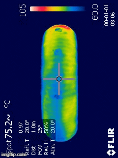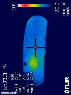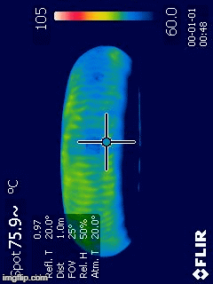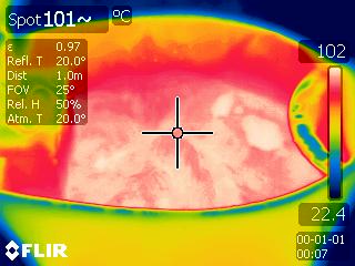 Given we can clearly identify the wire in all of the images, it shows that any air movement significantly affects the warmers. We see some hot spotting at the start of the wire run. We also notice the white area confirms the peak thermocouple reading of 103C (217F).