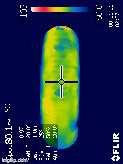 What we do notice here is the delta between the thermocouples and the center crosshair of the IR camera. Notice the peak reading is 99.6C vs 94.5C on the IR camera. This does make sense. There is a 60 second time delay between removing the warmers and taking the picture and we are not necessarily shooting the exact same point as the thermocouple, just around the same area. What we can see is the difference between the first and last frame after the warmers are removed and how quickly they begin to cool.