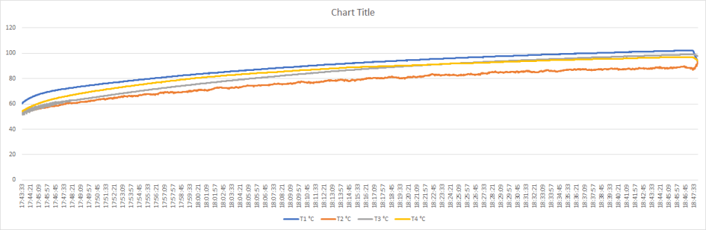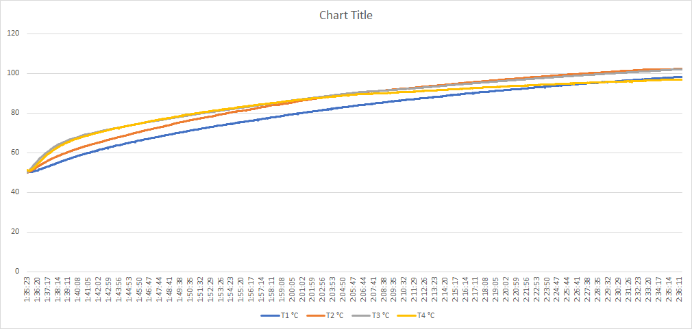 Steady state is technically” achieved, given the flattening of the curve after 1 hour, however the warmer is running 100% (approx 524 Watts) the entire time.