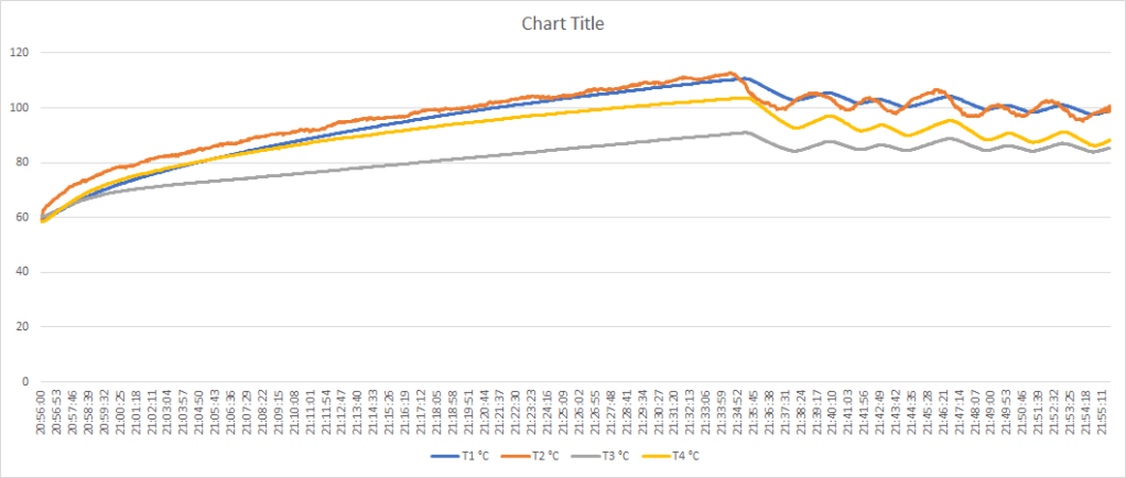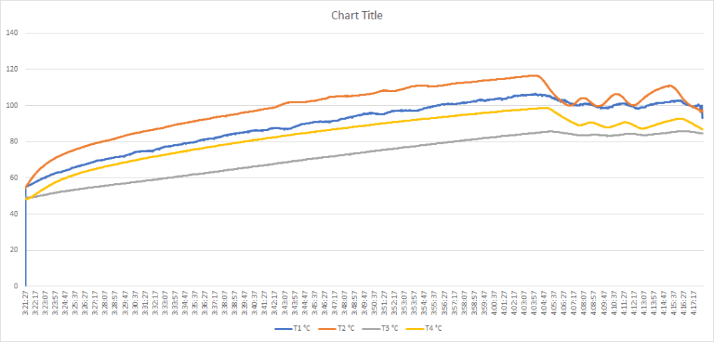 T1 (blue) reaches a max of 106.5 C (223 F) for multiple samples